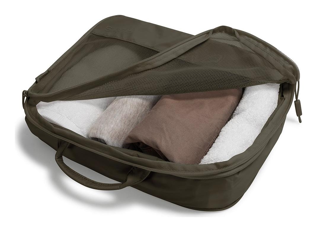 Kouzlo spočívá v chytrém kompresním zipu. Jednoduše naplníte obal, zapnete hlavní zip a poté druhým, kompresním zipem vytlačíte přebytečný vzduch. Vaše oblečení se tak smrskne a zabere mnohem méně místa. Organizéry jsou vyrobeny z inovativního a zároveň pevného materiálu Ecotex, který vzniká recyklací nylonových rybářských sítí vylovených z oceánu. Nejenže chráníte své věci, ale pomáháte i čistit moře.