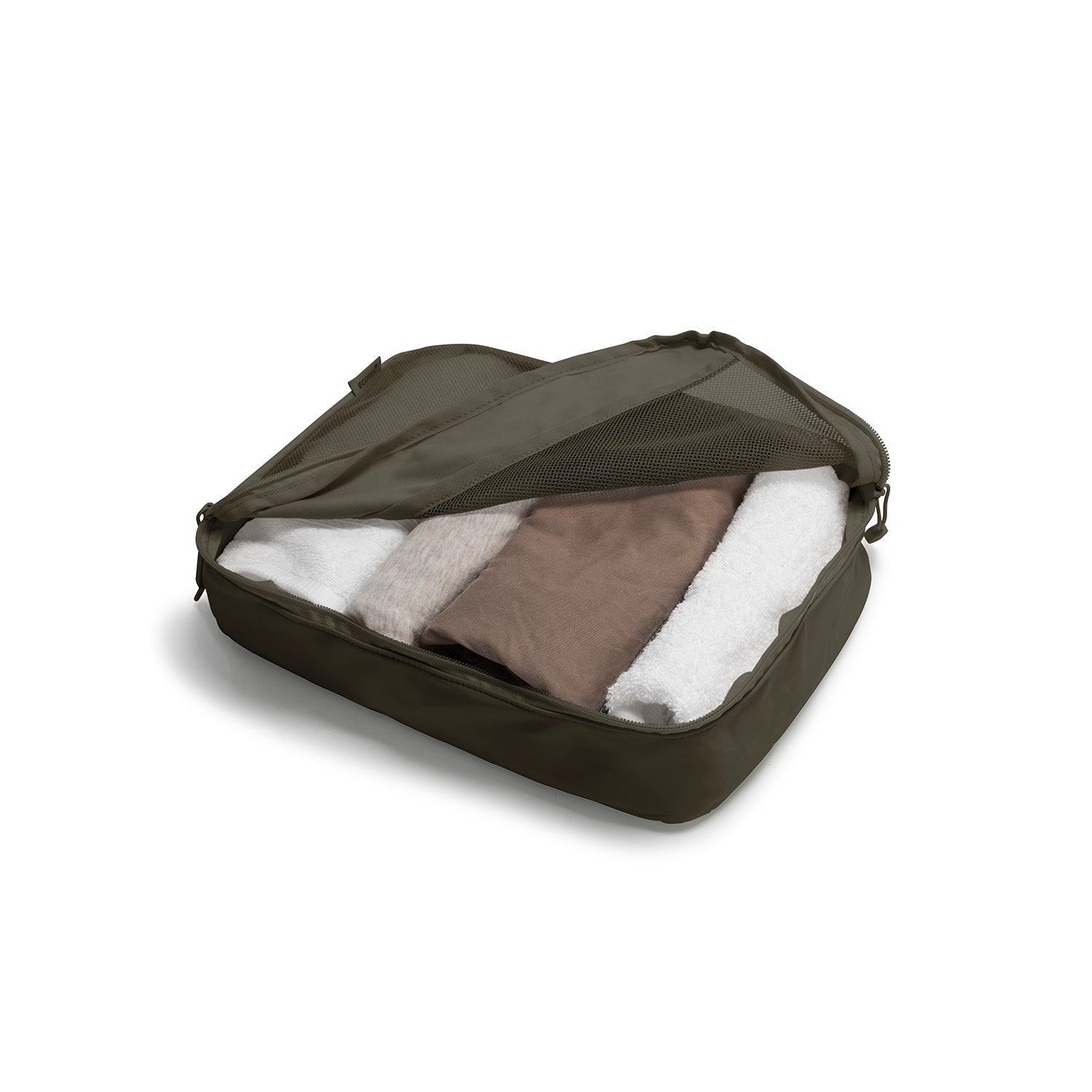 Tajemství spočívá v inovativním materiálu Ecotex, který vznikl recyklací nylonových rybářských sítí vylovených z oceánů. Tento lehký, ale mimořádně odolný materiál chrání vaše věci a zároveň pomáhá čistit naši planetu. Pětice obalů různých velikostí vám umožní přehledně roztřídit vše od objemného oblečení po drobné doplňky. Každý kus oblečení i příslušenství tak bude mít své místo.
