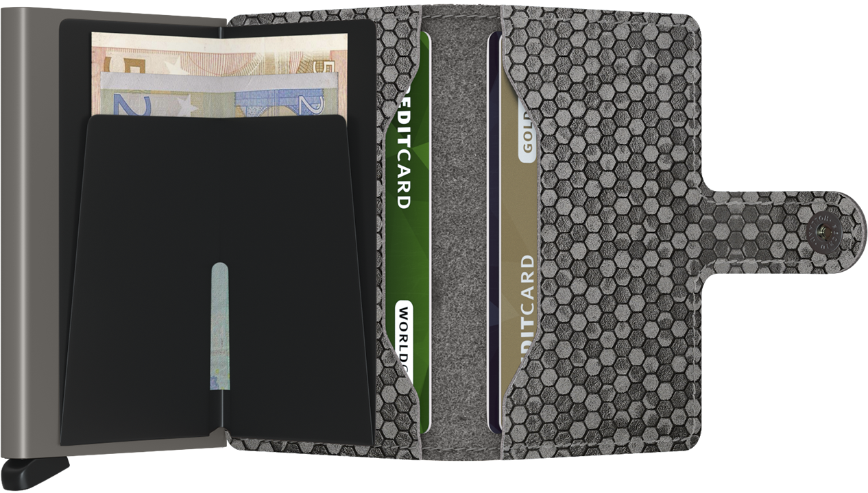 Srdcem peněženky je pevné hliníkové pouzdro, které spolehlivě chrání vaše karty před ohnutím, zlomením i nechtěným bezdrátovým skenováním. Unikátní patentovaný mechanismus vám jediným pohybem vysune karty do přehledného vějíře. Vše je obaleno v odolném materiálu s fascinujícím geometrickým vzorem Hexagon, který je nejen příjemný na dotek, ale dodává peněžence osobitý a moderní vzhled. Díky praktickému zapínání na druk a promyšlenému vnitřnímu uspořádání máte navíc dostatek místa na bankovky, vizitky či účtenky.