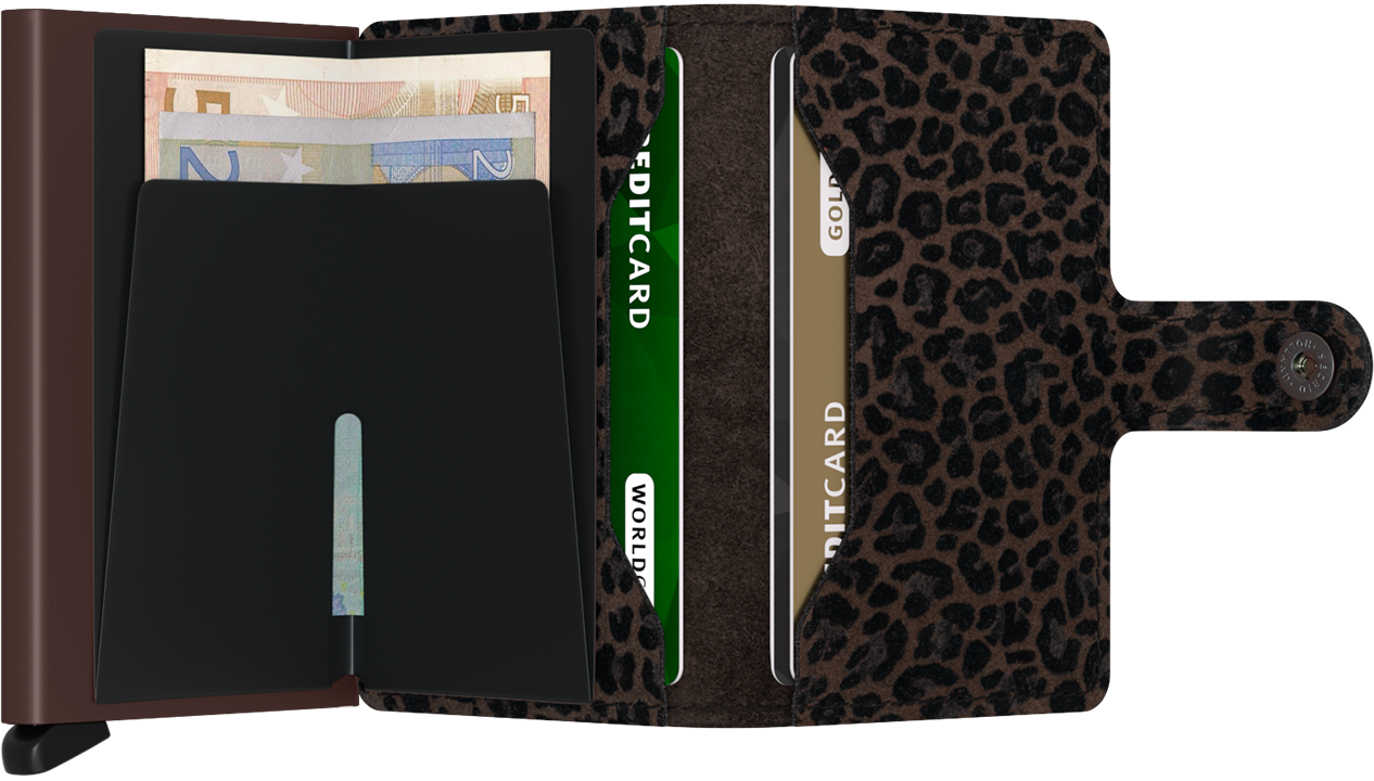 Srdcem peněženky je pevné hliníkové pouzdro, obalené do luxusní kůže s odvážným a sofistikovaným zvířecím vzorem Leo Brown. Tento jedinečný design promění praktický doplněk v nepřehlédnutelný módní kousek, který zaujme na první pohled. Díky promyšlenému provedení a zapínání na druk zůstává vše bezpečně na svém místě, ať už míříte na pracovní schůzku, nebo večer do města.
