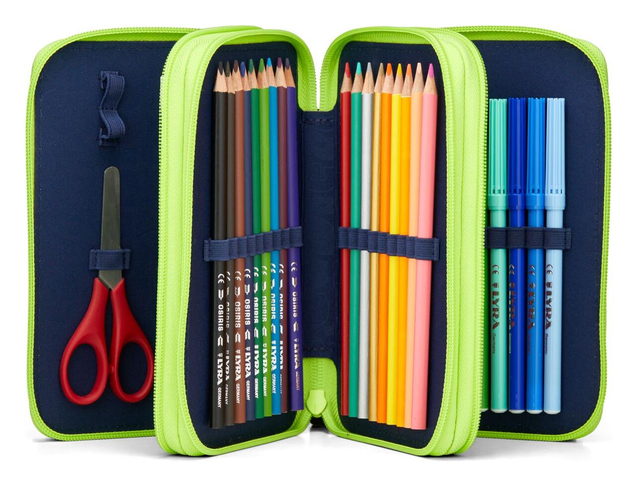 Třípatrový penál Ergobag Maxi představuje komplexní řešení pro školáky, kteří potřebují mít své psací potřeby dokonale uspořádané a vždy po ruce. Tři samostatná patra na zip umožňují přehledně roztřídit veškeré školní pomůcky. Jako bohatě vybavený set přichází rovnou naplněný kvalitními potřebami značky Lyra. Tento maximálně prostorný penál je ideální pro starší školáky nebo pro všechny kreativní děti.Stejně jako ostatní produkty Ergobag je vyroben z recyklovaných PET lahví a designově ladí s aktuálními kolekcemi batohů.