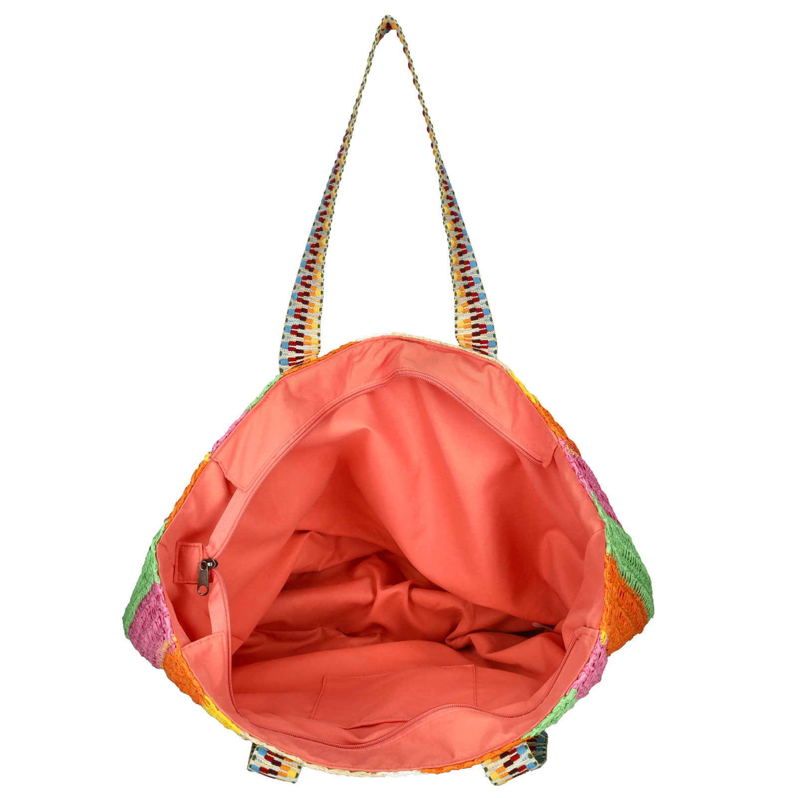 Vyrobena z kvalitní přírodní rafie, tato taška zaujme svým jedinečným pleteným designem a veselými barvami. Nabízí velkorysý prostor pro všechny vaše nezbytnosti, od plážové osušky a krému na opalování až po denní nákup. Pevná konstrukce zaručuje, že si taška udrží svůj tvar a bude vám spolehlivě sloužit. Vnitřní podšívka chrání obsah a praktické uzavírání na zip se postará o bezpečí vašich věcí.