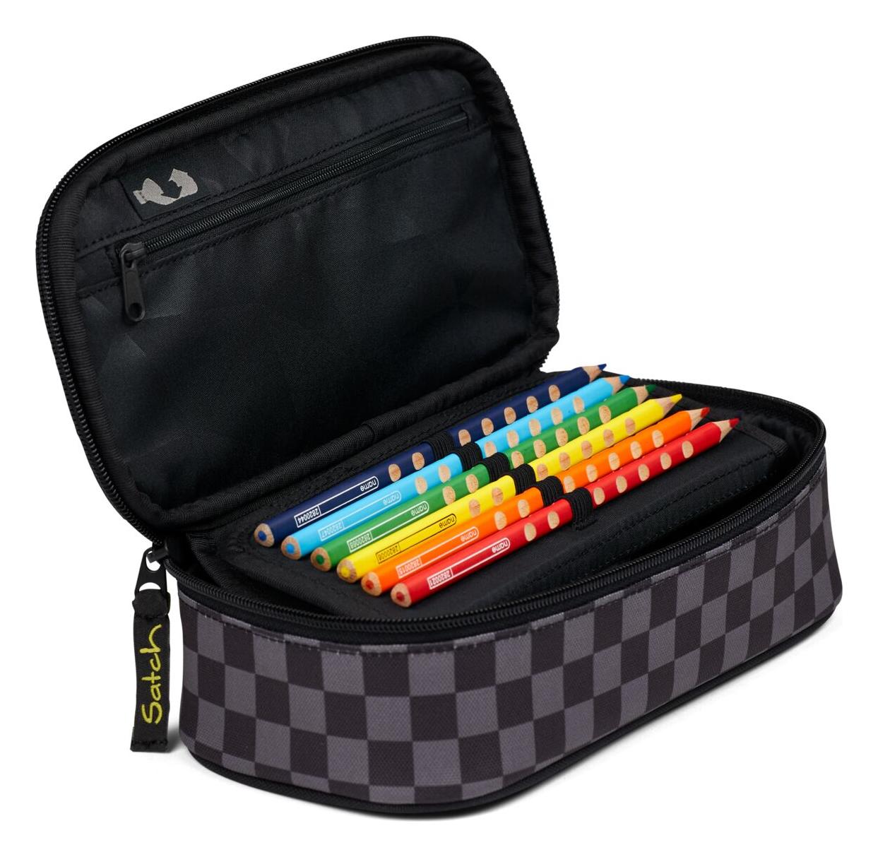 Udržet pořádek v tužkách, perech a dalších psacích potřebách může být hračka s penálem Satch Pencil Box. Tento penál je navržen pro maximální přehlednost a organizaci. Jeho hlavní devizou je praktická výklopná klopa s poutky, která zajistí, že nejoblíbenější psací potřeby budou vždy úhledně srovnané a okamžitě po ruce. Samozřejmostí je i speciální kapsa na trojúhelník a malá kapsička na zip pro drobnosti. Prostorná hlavní komora pak pohodlně pojme vše ostatní, jako jsou nůžky, lepidlo či zvýrazňovače. Stejně jako ostatní produkty značky Satch je i tento penál vyroben z recyklovaných PET lahví a jeho design perfektně ladí se školními batohy. Satch Pencil Box je tak víc než jen penál – je to chytrý organizér pro každého školáka.