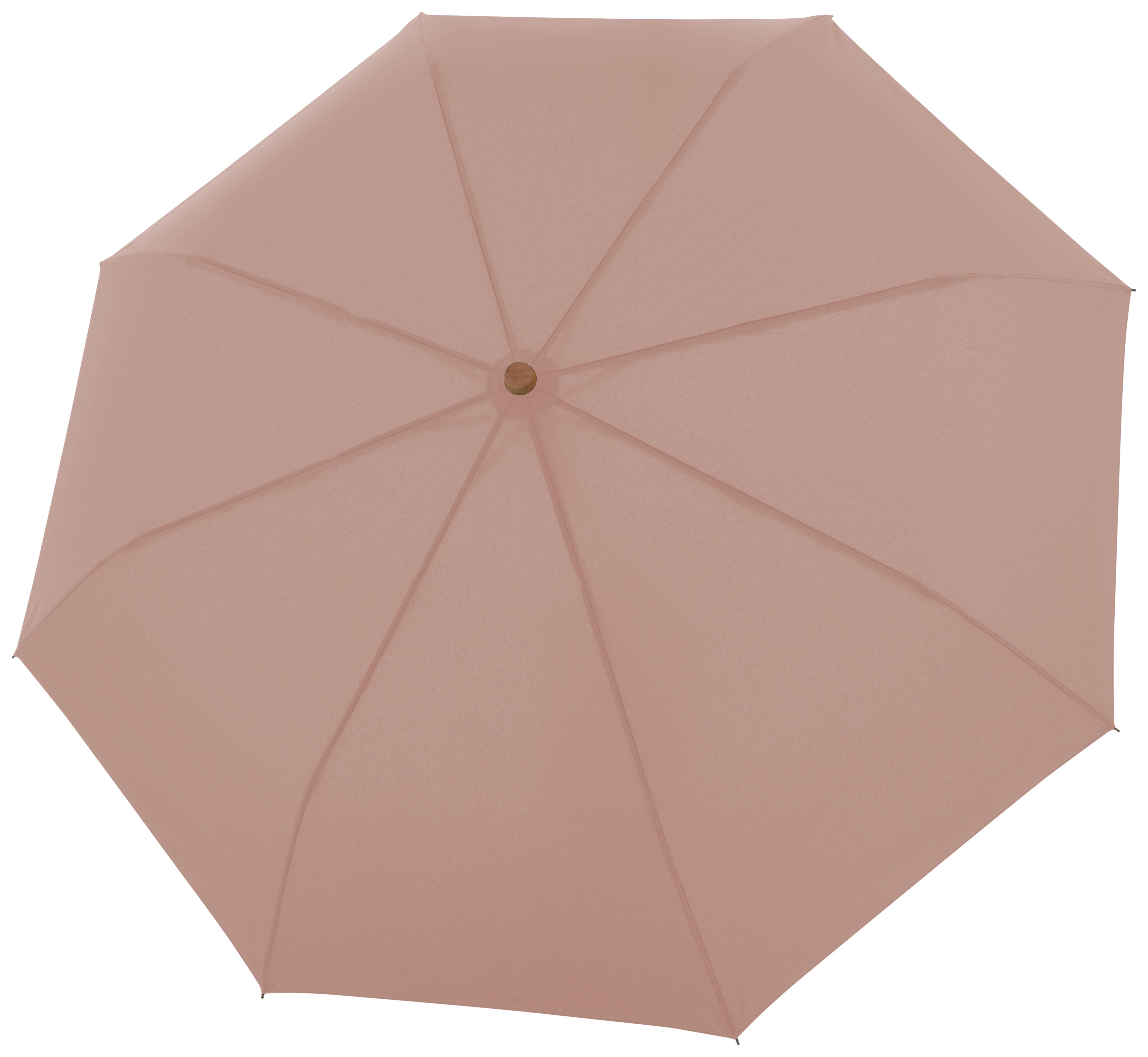 Deštník se pyšní plně automatickým systémem pro bleskové otevření i složení. Jeho konstrukce kombinuje odolnou ocel a pružný sklolaminát, díky čemuž obstojí i v silnějším větru. Potah v něžném růžovém odstínu není jen krásný na pohled, ale je vyroben z recyklovaných plastových lahví. Rukojeť z certifikovaného dřeva příjemně padne do ruky a dodává deštníku punc luxusu.