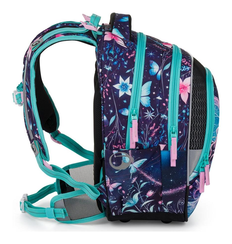 Udržet pořádek bude hračka. Tři prostorné komory poskytují dostatek místa na všechny učebnice, sešity i svačinu. V přední kapse se skrývá praktický organizér na mobil, peněženku a klíče. Pevné dno s plastovými nožkami chrání obsah před nečistotami a zajišťuje, že batoh stabilně stojí vedle lavice. Bezpečnost na cestě do školy pak zaručuje velké množství reflexních prvků, díky kterým bude vaše malá víla vidět za každého počasí.