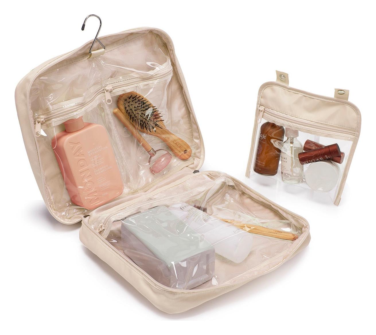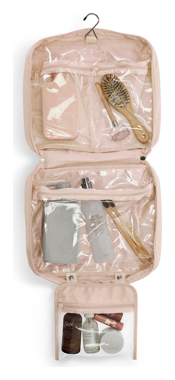 <p>Stylová toaletní taštička pomůže s uložením a přepravou toaletních potřeb i kosmetické výbavy. Rozkládací design a dobře omyvatelný interiér se třemi velkými kapsami z průhledného voděodolného materiálu umožní mít dokonalý přehled o všech věcech uvnitř. Díky praktickému háčku je možné tašku pohodlně pověsit například na dveře nebo držák v koupelně. K dispozici je rovněž odnímatelné transparentní pouzdro a velká vnější kapsa na zip, do níž se vejde žínka i menší cestovní ručník.</p>